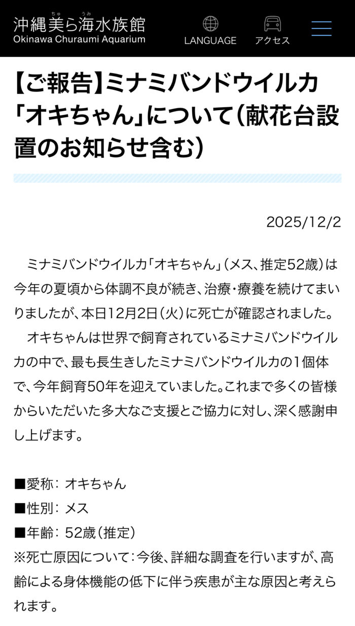 そう考えると、オキちゃんは推定52歳とのことで、長生きのイルカさんである。